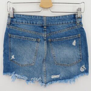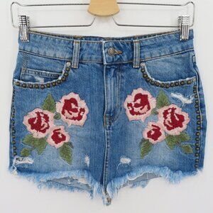 Free People Wild Rose 24 Emrboidered Floral Studded Raw Hem Denim Jean Skirt
