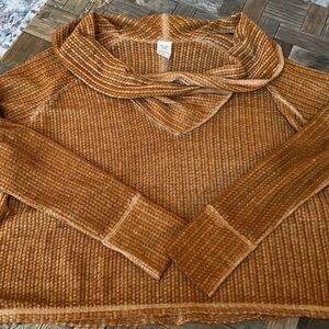 Free People Wildcat Country Road Thermal Top. Slouchy cowl neckline. Relaxed fit. High low raw edge detail. Raglan sleeves. Waffle knit. Banded cuffs. Side slits. Color: country road/cedar. Size Small