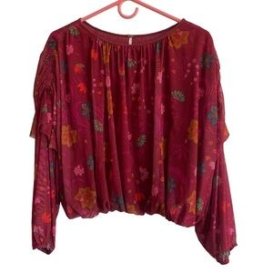 Super cute floral Free People top. This has a billowy fit with an elasticized hem and cuffs. Size XS and in excellent preowned condition; no visible flaws.