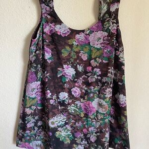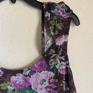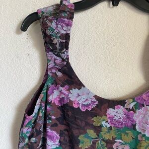 Soft cotton-blend, floral print detail all over, low scoop-neckline, puffy cap-inspired short-sleeves, low scoop-back detail, lined