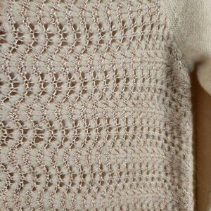 Free People Willow Caroline Bohemian Wool Angora Carjacking Sweater, Size XS. Pit to pit 19", shoulder to hem 26", 3 Crackle Button Closure, Open Knit Bodice, V Neck, Soft Pink Color With Subtle Pink Metallic Thread Throughout, Retail $108, Hard To Find Color. Good Pre-Owned Condition