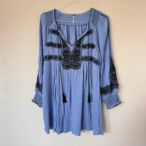 Free People Wind Willow Boho Embroidered Tie Neck Tunic Dress Women's Size S Oversized Blue. Unlined.