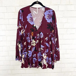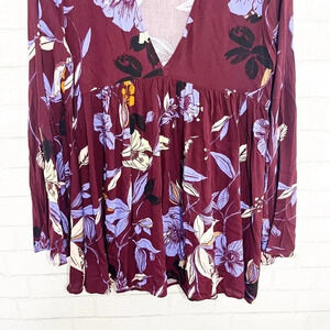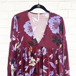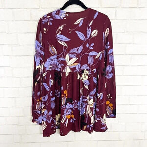 Free People Wine Floral Bell Sleeve Boho V Neck Babydoll Blouse Women's Size XS