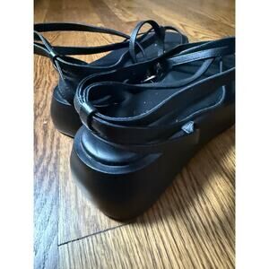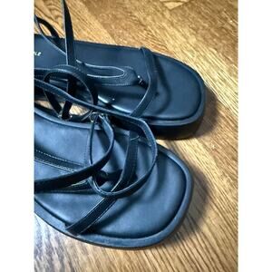 Features: Slip-on style, leather uppers, semi-square open toe, thong style, adjustable wrap buckle ankle strap, flatform sole, lined footbed