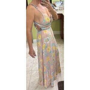 Free People Wisteria Pastel Floral Cutouts Maxi Dress light combo XS boho, hippie, open back, tie back straps, adjustable straps, has pockets, sexy. summer, spring, cocktail, resort, vacation, date, easter, flowers, daisy, pink, yellow, blue, grey, rose, cottage, fairy, girly, princess,
