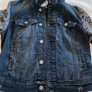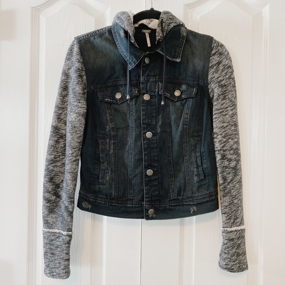 Free People Woman’s Distressed black denim jacket with removable hoodie size xs.