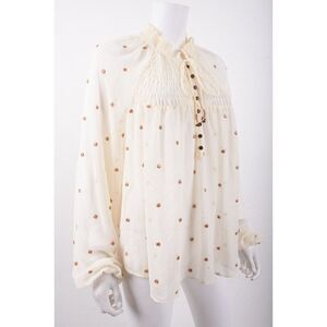 Free People Womans Blouse Shirt Top Size M Ecru Beige Gold Dots Oversized. 100% polyester. Gold embroidered dots with sequin center throughout. Smocked neck and upper bodice. Buttons Upper front with tie at neck. Balloon sleeves with elastic at cuffs. Sheer chiffony fabric. Longer in the back.