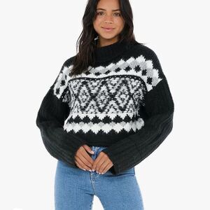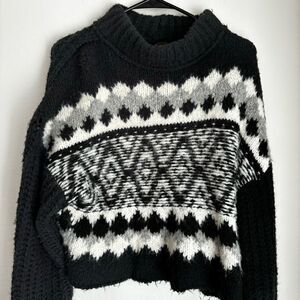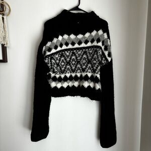 Has been worn but has a lot of life left! Super cute slightly cropped sweater with a fair isle pattern. Runs slightly big. Would also fit a medium!