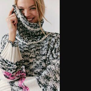 The Free People Winter Storm Tunic features a marled knit with striped cuff details and a stacked turtleneck. It has a relaxed, oversized and longline fit.