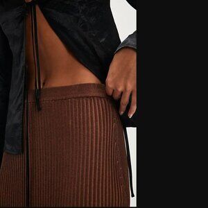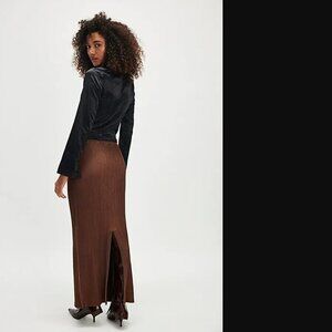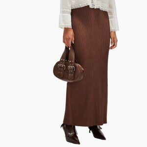 This maxi skirt from Free People features a high-rise, column silhouette, a pull-on design, a soft ribbed fabrication, and a back vented hem.
