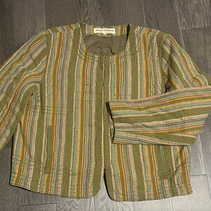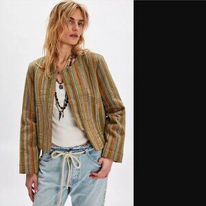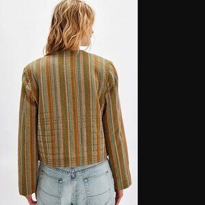 This lightweight jacket from Free People features retro striping throughout, hook-front closure, and slightly structured shoulders. The jacket has a boxy, slightly cropped fit, scoop neckline, stitching throughout, and side pockets. It is a quilted jacket.