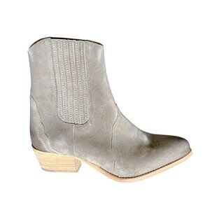 These ankle boots by Free People feature a Western-inspired design with a sleek gray suede exterior. The pull-on style ensures ease of use, making them a versatile addition to any wardrobe.