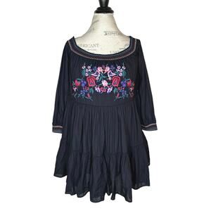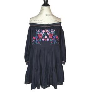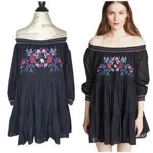 Pre-owned women’s Free People Sunbeams floral embroidered off shoulder mini sun dress. Features 3/4 length sleeves and tiered skirt with ladder lace inset detail.
