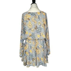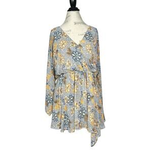 Pre-loved women’s Free People Teegan floral flowy chiffon mini dress. Features surplice faux wrap neckline, cinch waist with drawstring, two pockets, asymmetrical skirt, and partial inner lining. Sleeves are slightly sheer.