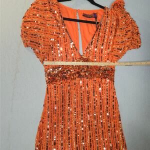 Free People Women XS Mini dress Celeste Orange Sequin Stars Celestial Event Prom. Embellished with Sequin Waistband featuring star pattern. 2 small slip pockets just below waistband. Hidden back zipper, and button closure at neck. Lined. Opening in back. In good, pre-owned condition with no noted rips, tears or stains. Measurements in description and in pictures with ruler. Please see pictures as they are considered part of the description.