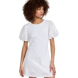The Free People Women's Apricot Rose Mini Dress in white, size XLarge, features a round neck, puff sleeves, and eyelet accents. This knit fabric dress is perfect for parties, cocktails, or casual occasions, with a short length and a zipper closure. The dress is lined, has a cut-out detail, and is machine washable. Made from cotton, it exudes a bohemian theme and is ideal for summer and spring seasons.