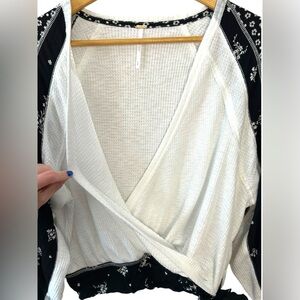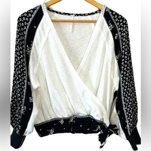 Free People Womens Auxton Thermal Waffle Black White Floral Boho Oversized Top