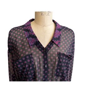 For Sale is a beautiful FREE PEOPLE Blouse size XS. Features a collared neck, button front, boxy cut with two chest pockets, long sleeves with buttons to roll up the sleeves. Fabric is very sheer, 100% Polyester, hand wash cold.