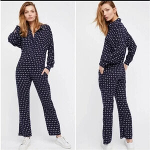 This is a navy blue with white geometric print, long sleeve button up collared jumpsuit. The fabric is lightweight and comfortable. It looks really cute with an oversized cardigan. The jumpsuit is in great preowned condition. Smoke free home.