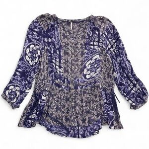 Free People Women's Blue Patterned Boho Dropwaist Tunic Blouse Top Size Medium