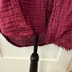Burgundy button up gauzy Free People tunic shirt with fringe bottom. In good used condition. A couple loose threads. See picture.