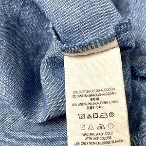 Description: Free People women's chambray Show Some Shoulder top in very good preowned condition, no stains or flaws noted; off shoulder style, 3/4 sleeves with cuff ties