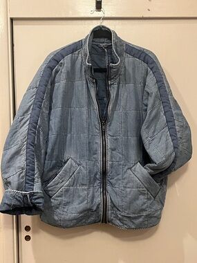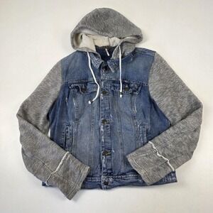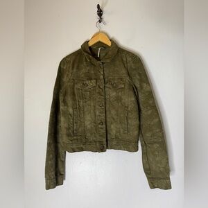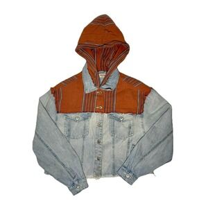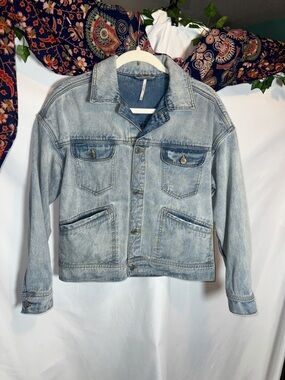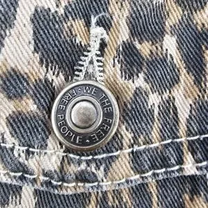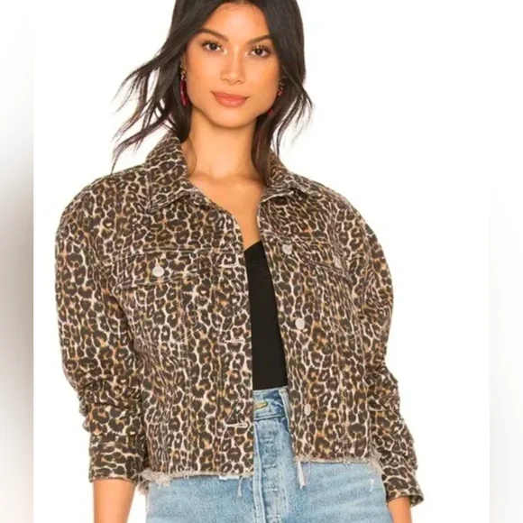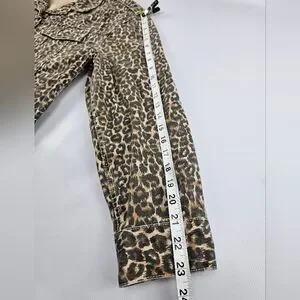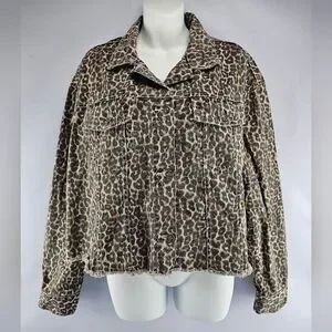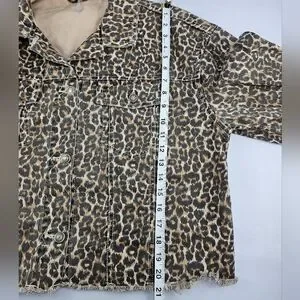 Free People Women's Cheetah Print Raw Hem Denim Jacket Oversized Cropped Medium
