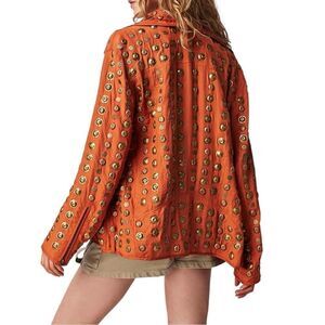 Taking the moto jacket to the next level, this soft, slouchy version is featured in an oversized, relaxed fit with exaggerated metal coin detailing throughout for an effortlessly edgy style.