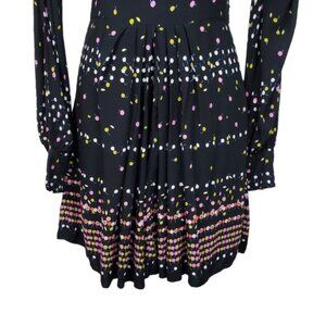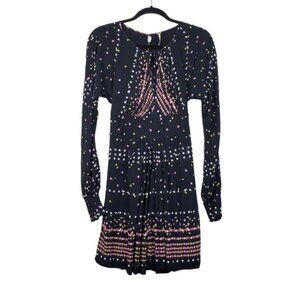 Free People Coryn long sleeve printed open back mini dress in black, pink, white, blue, yellow and orange. Lined. Open cutout back. Keyhole tie front detail. Button zip closure on back. No stains or holes. Casual spring summer fall boho mini dress.