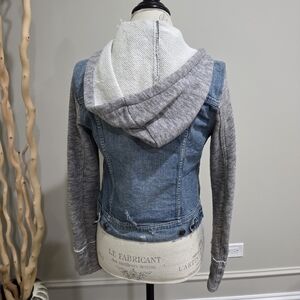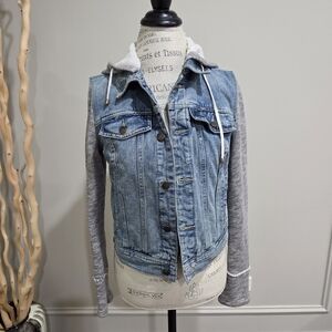 Stylish denim jacket with attached gray sleeves. Perfect for layering.