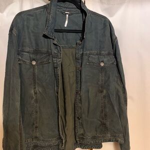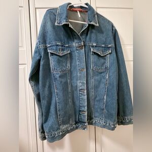 Free People women's studded jean jacket in good preowned condition, distressed, relaxed fit, button front, pockets, oversized trucker jacket