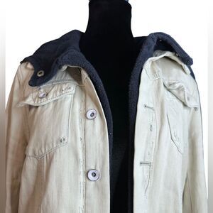 Good used condition distressed jacket. Lined with a hoodie. Heavyweights. No stains. Obvious signs of distressing, but that’s the intentional style. All buttons present. Medium.