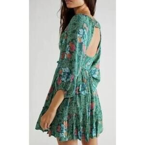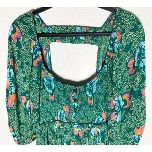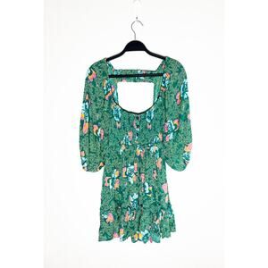 Free People Women's Endless Summer Summer Picnic Printed Smocked Mini Dress Green Floral Scoop Neck Backless Puff Sleeves Tiered Ruffles Flowy Lined Romantic Baby Doll Floral