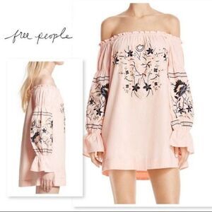 Get festival-ready in Free People's dreamy peasant dress. This short and chic style sits off the shoulder, the silhouette emphasized by puffy bishop sleeves with flared cuffs. Floral embroidery infuses the piece with creativity and color. Pullover styling Short length Bandeau neckline; A-line silhouette Long bishop sleeves with flared cuffs; off-the-shoulder design Floral embroidery at front and sleeves Unlined All cotton Machine washable