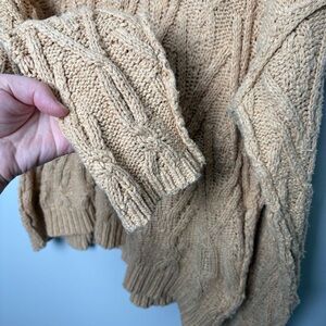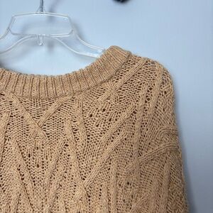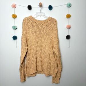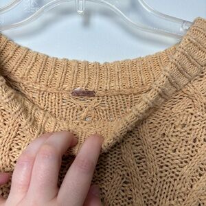 Stay cozy and stylish with the Free People cable knit sweater in a warm tan hue. Perfect for layering. Size medium. Minimal wash wear. Good condition!