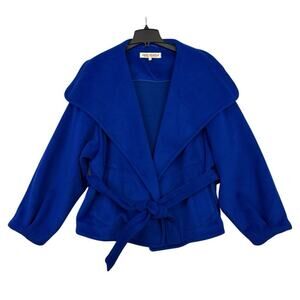 Chic and cozy, this Free People women’s jacket in a striking royal blue features an oversized shawl collar, open front design, and a matching self-tie belt for a flattering fit. Crafted from a polyester-viscose blend, it offers soft structure with a modern silhouette. Perfect for layering over casual or dressy looks. Size XL – see measurements for best fit. Style effortlessly transitions from work to weekend wear.