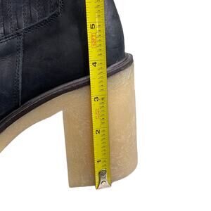 Make a statement in these cool leather chelsea boots featured in a chunky heeled design with elastic side details and a slim silhouette. These boots feature intentionally distressed detailing for a worn in look. These are in very good preowned condition with scuffs on the inner side toe area.