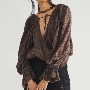Free People Womens Kylie Reversible Horseshoe Brown Check Blouse Boho Small