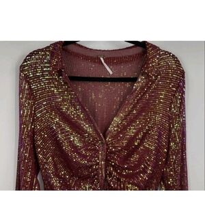 Free People Women's L Sequin Cranberry Semi-Sheer Button Up Long Sleeve Shirt