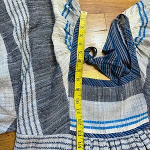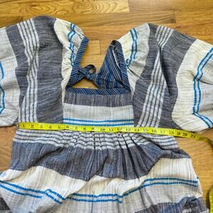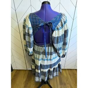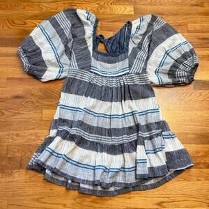 Free People Women’s Large Blue Indigo All Lined Up Mini Dress Striped Cottage New. Square neckline. Puff sleeves. Elastic on the back waistband. Backless with mid-back tie. No stretch to the material. New with tags.