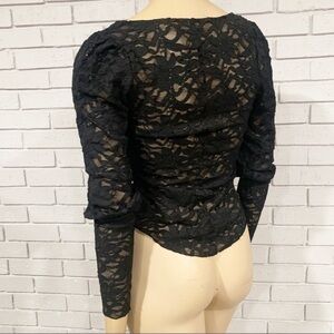 A sheer lace fabric with shirted shoulder detail make for a standout top that can be dressed up or dressed down.