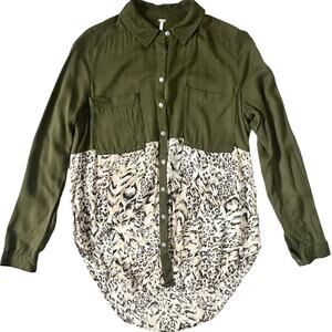 Free People Womens Long Sleeve Collared Button Down, Animal Print Olive Green XS