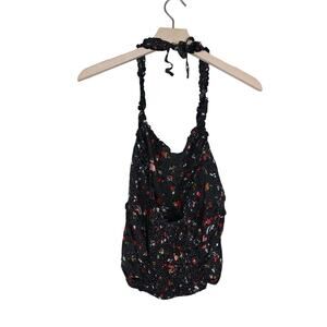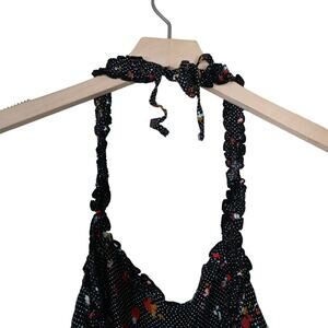 Retro printed top featured in a halter silhouette with ruffle trim.