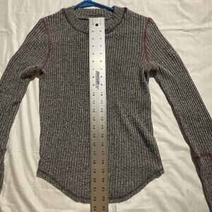 Keywords: Free People thermal, lace-up sleeve top, grunge style shirt, women’s medium, gray ribbed top, mountaineer cuff thermal, edgy casual wear, festival layering piece, soft stretch thermal, EUC Free People, red stitch detail, rayon blend top.