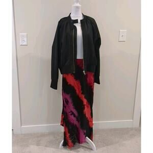 The Free People Women's M Whimsigoth Bomber Jacket in Midnight Black is a stylish and versatile streetwear piece perfect for various occasions such as travel, parties, casual outings, and workwear. Made from polyester with a relaxed fit, this jacket features a zip and button closure, long sleeves, and pockets for added convenience. The black color and solid pattern make it easy to pair with different outfits, while the punk, grunge, bohemian, and retro themes add a unique flair to your look. Machine washable and crafted by the brand Free People, this bomber jacket is a must-have for any fashion-forward woman. See the detailed pictures for the excellent condition of this jacket.