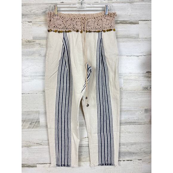 Free People Womens M cream blue In Dreams Embellished Harem Pants Stripe Crochet