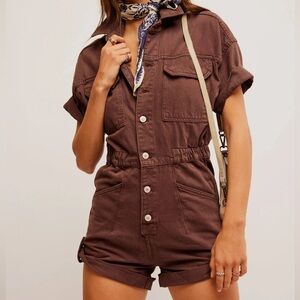 Free People Women's Marci Cuffed Shortall Brown Denim Romper