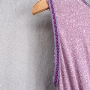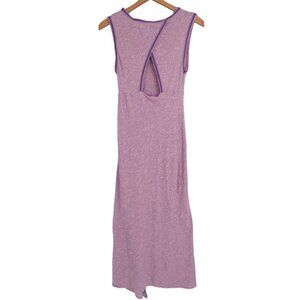 Free People women's sleeveless maxi length dress, rustic heathered purple color, soft stretchy fabric with peasant texture and trim. Small back opening, long split V from hem in front, mid body is lined with an extra layer of smooth purple fabric. Size XS, very nice pre-owned condition with two small flaws - see pics showing two very small holes in fabric. Smoke free home!