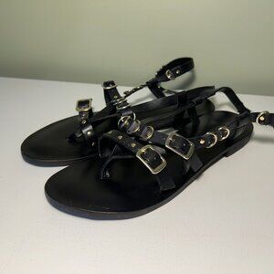 So chic and strappy, these bold sandals are featured in a wrap-inspired silhouette and flat-sole design with adjustable buckle detailing and a round toe.