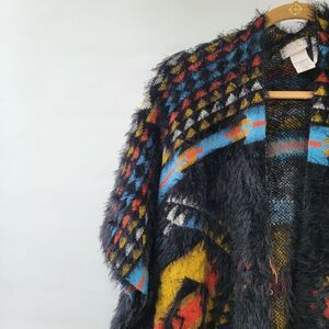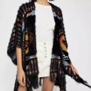 Free People Womens OS Southwesten Bohemian Black Fringe Fuzzy Cardigan Poncho
